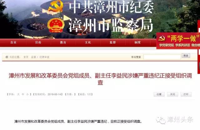 漳州頭條從中共漳州市紀委、漳州市監察局網站獲悉,州市紀委今天早上剛剛權威發布,漳州市發展和改革委員會黨組成員、副主任李益民涉嫌嚴重違紀,目前正接受組織調查。