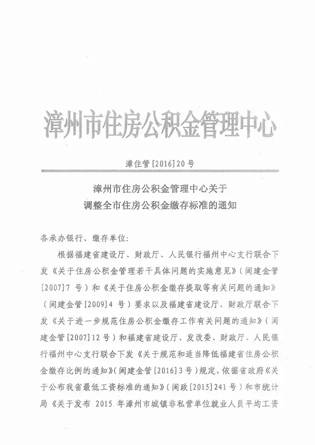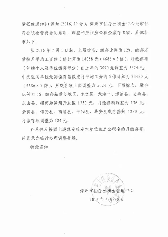 下限標準:繳存比例為5%,繳存基數薌城區、龍文區、龍海市、漳浦縣、長泰縣、東山縣、招商局漳州開發區1350元,月繳存額調整為136元。雲霄縣、詔安縣、南靖縣、平和縣、華安縣繳存基數1230元,月繳存額調整為124元。