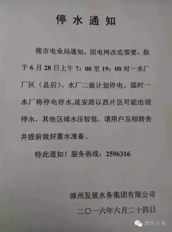 市民有疑問,可撥打漳州發展水務集團有限公司服務熱線:2596316谘詢。
