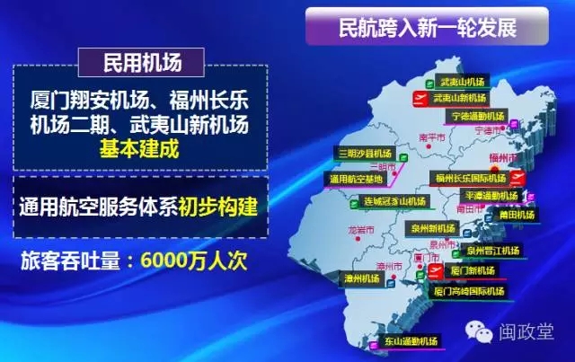民航計劃完成投資800億,廈門翔安機場、福州長樂機場二期、武夷山新機場基本建成,通用航空服務體係初步構建。全省民航旅客吞吐量突破6000萬人次。